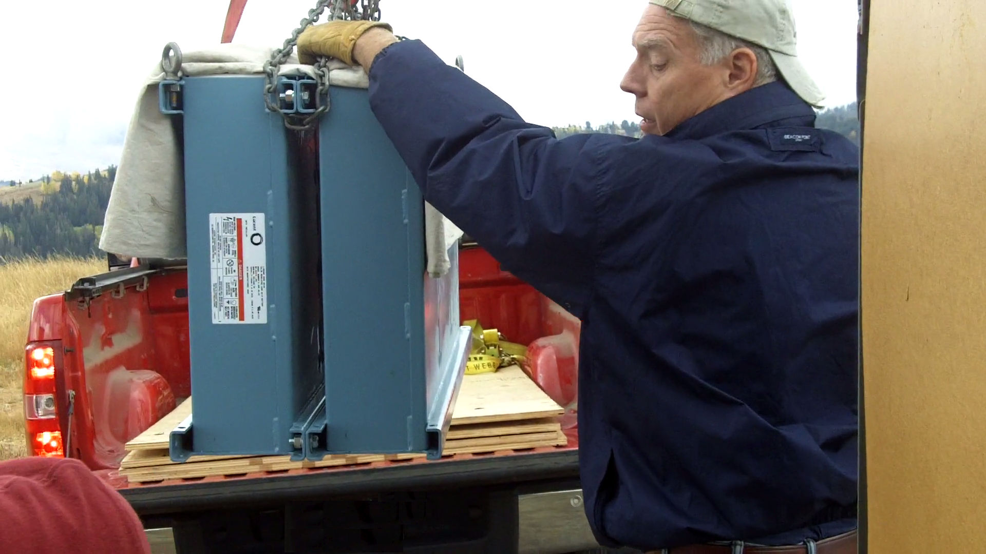 With the weather rapidly changing — and the uncertain state of the current battery bank — the pressure was on, but Bryan and his friend and co-worker, Randy, got to work. Borrowing a hoist they were able to lift the modules up, stand them on end and bolt them together. On the day of the installation a portable gantry was set up to put it into Randy's one-ton truck and a myriad of straps used to secure it into place.