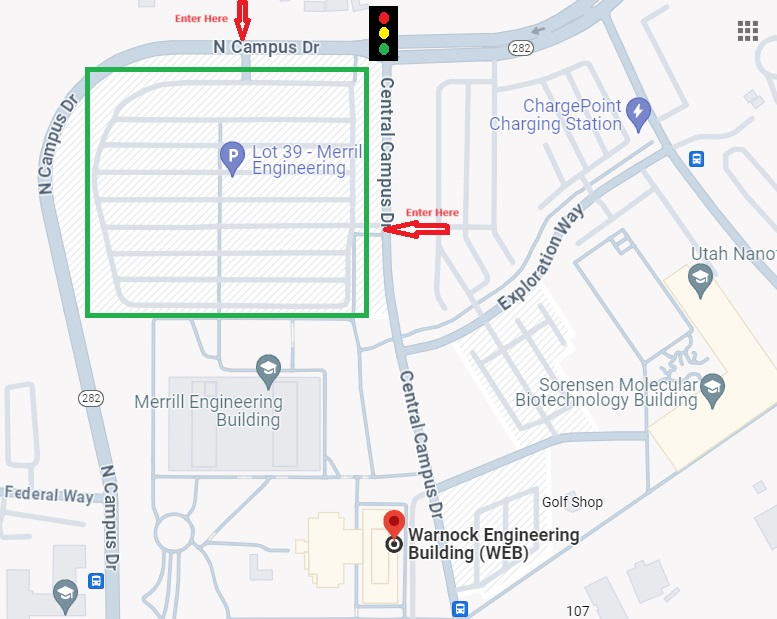 From the west: Approach the campus by driving east on 100 South. Follow the road as it makes a left turn and a right turn to become “North Campus Drive.” Turn right at the traffic signal onto “Central Campus Drive.” Turn into the large lot north of Merrill Engineering Building (lot #39). This lot is is green in the map, with arrows showing the entrances. Because of new construction of the Price computing and Engineering Building, the lot east of the Warnock Engineering Building is no longer an option.